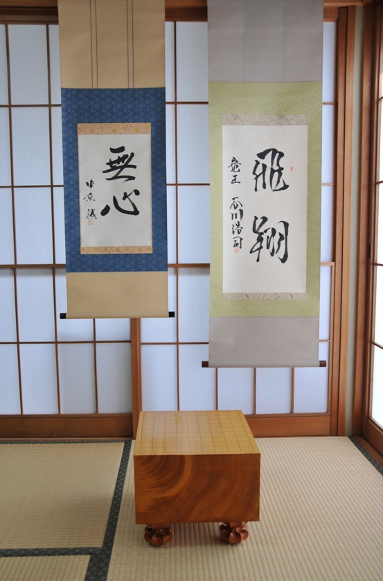 代わりに、特別に許可を頂いた「永世名人」2名による掛け軸を掲載。