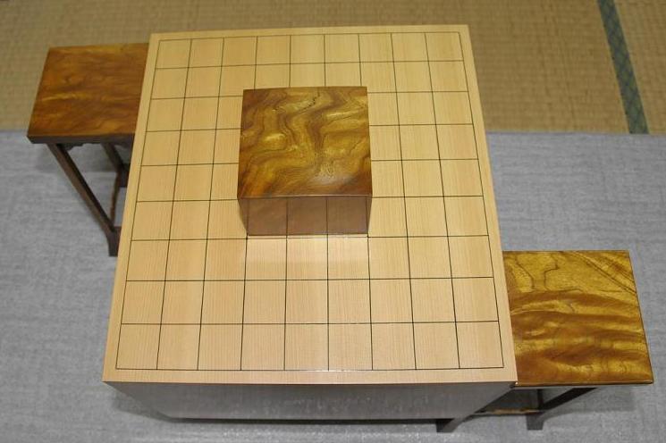 その両脇に駒台を設置する際、天板が柾目の駒台なら自然に盤の柾目に沿って合わせがちだが、「斑」や「杢」の入る天板の場合、これには感美的な個人差も出て、統一の作法として定着させるのは難しいのではないかと思う。